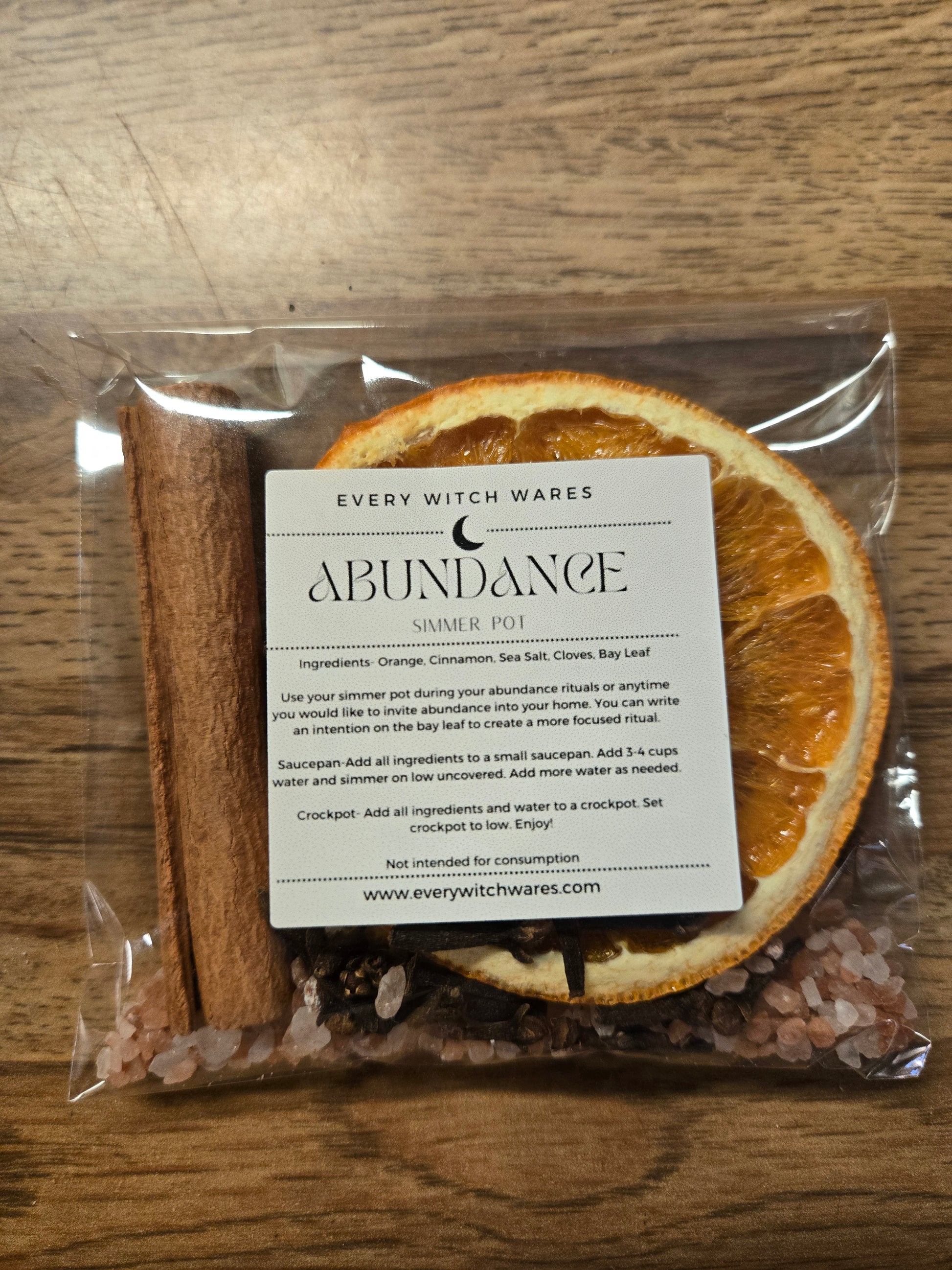 Invite abundance into your home with this abundance simmer pot. Each kit includes oranges, cinnamon, cloves, pink himalayan sea salt, and a bay leaf. Simmer in a small pot on the stove top or a small crock pot on high.